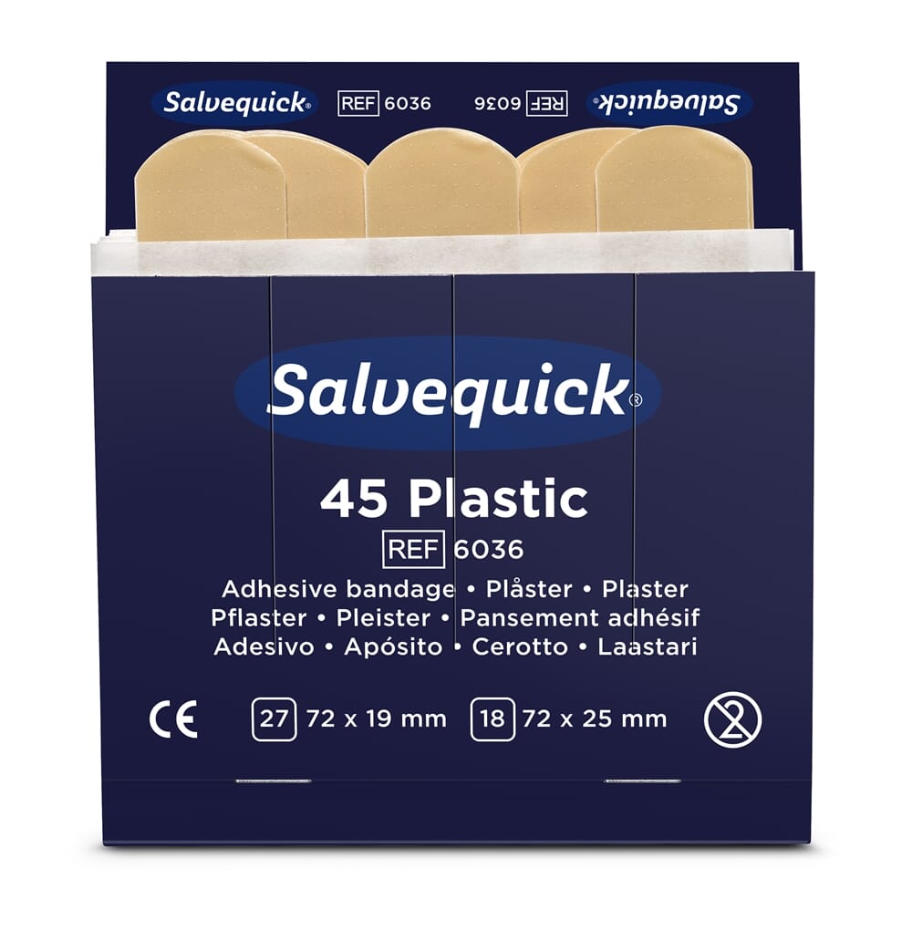 Hver eske inneholder 45 stk. Salvequick plastplaster, hvorav 27 er i størrelsen 72 x 19 millimeter og 18 er i størrelsen 72 x 25 millimeter. Plastplastrene inngår i og kan anskaffes separat som refill til veggstasjoner som har Salvequicks plasterautomat, f.eks. Cederroths førstehjelpsstasjon, -skap og -tavle.