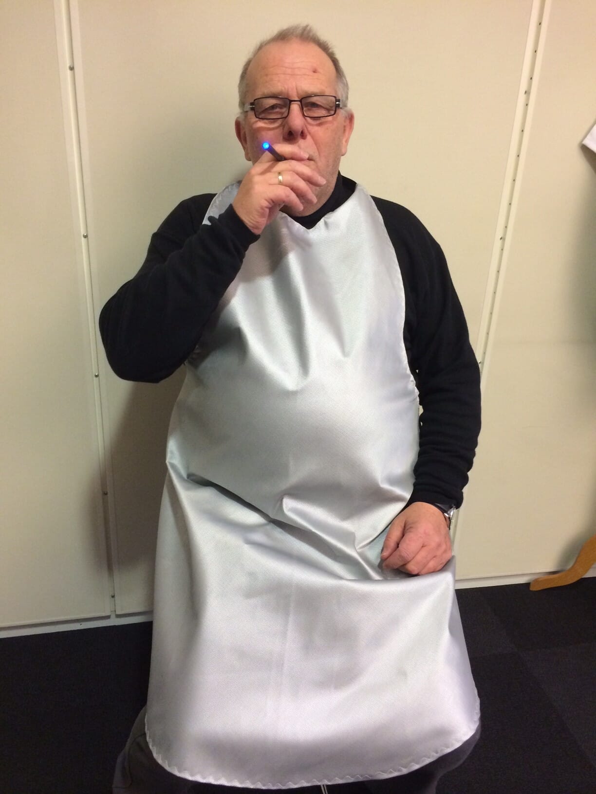 - Dette er ett brannhemmende forkle som skal forebygge brannulykker ved røyking.