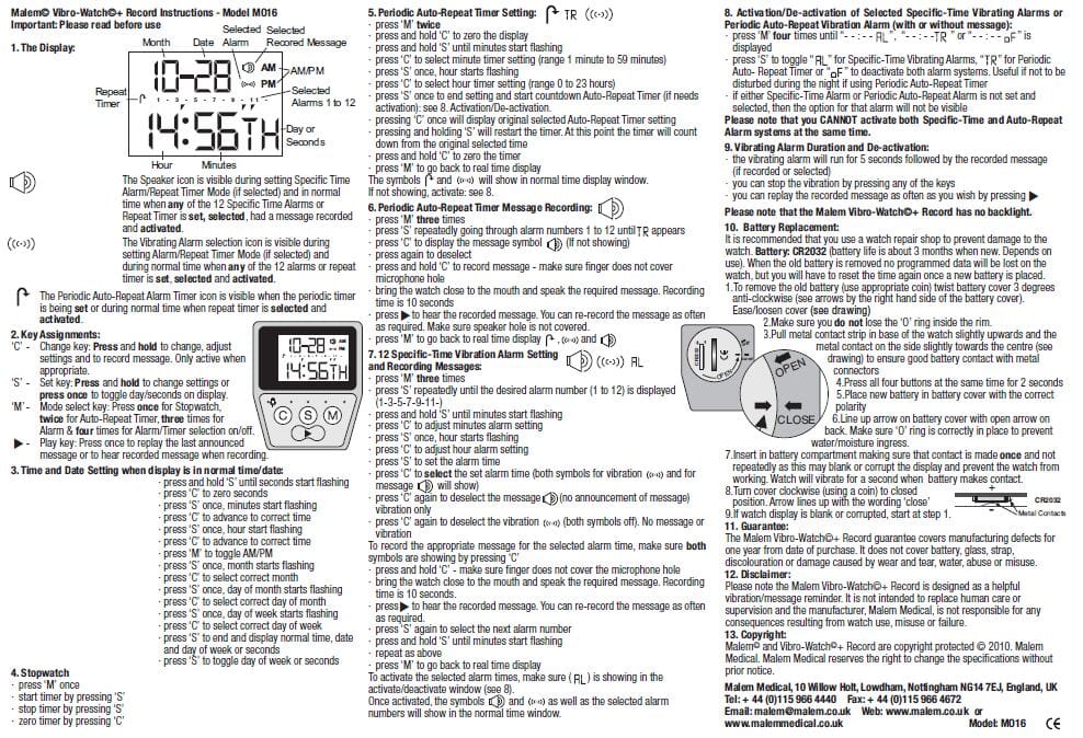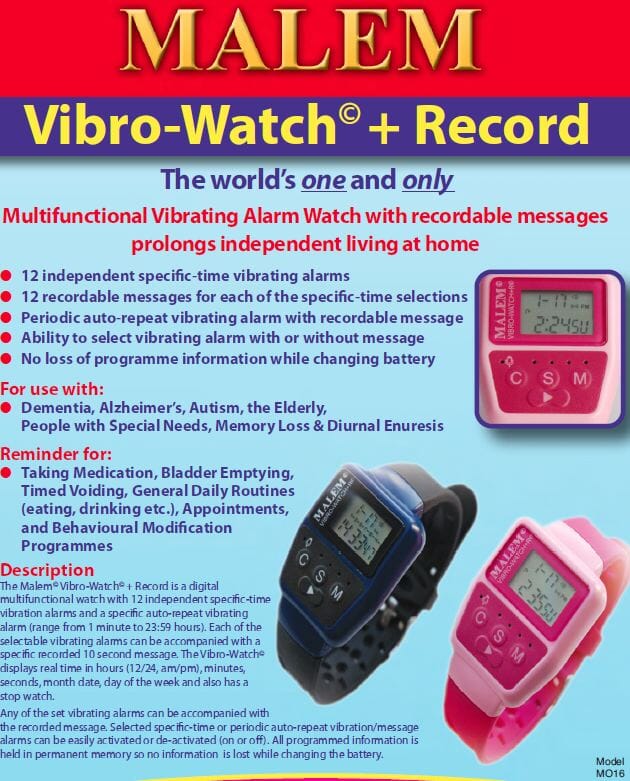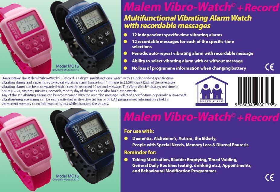 Påminnelse ved vibrasjon eller tale. 12 uavhengige bestemt gangs vibrerende alarmer 12 innlesbare meldinger for tale alarmer.