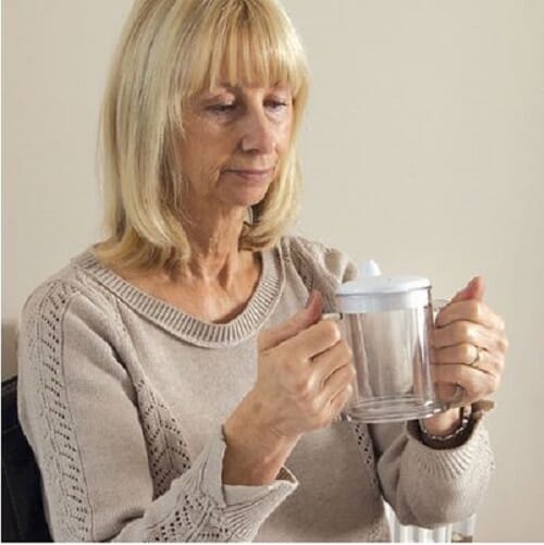 Denne brede koppen gjør lettere å drikke for alle med nedsatt hånd eller håndledd funksjon.
