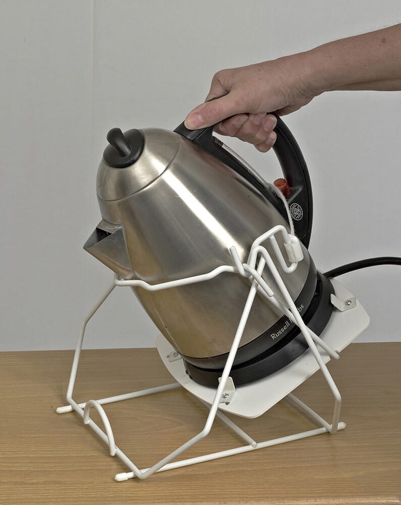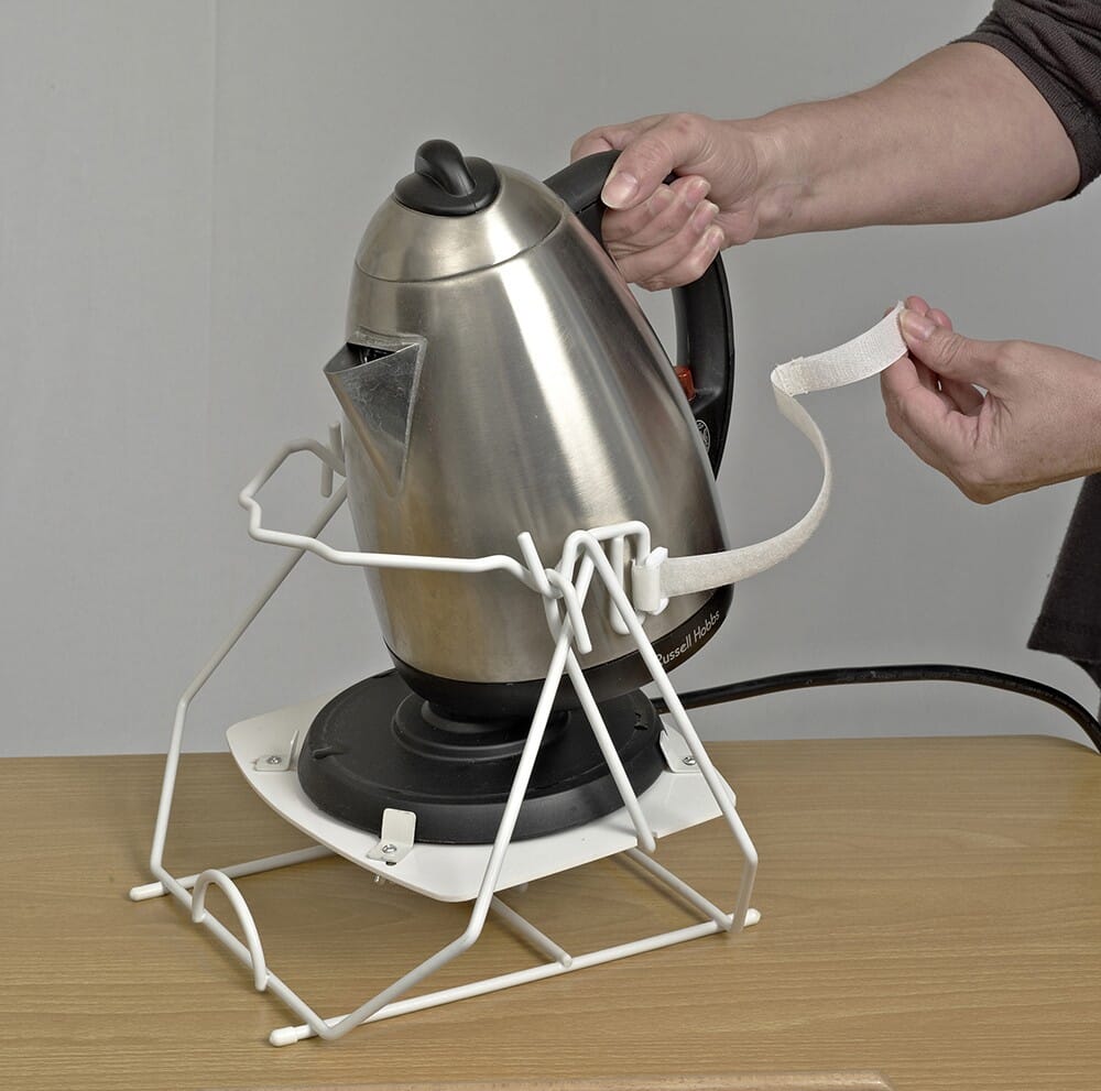 - Med en krok, stropp og klemmer som holder vannkokeren på plass