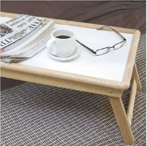 - Toppen av brettet kan brukes flat for å spise eller drikke, eller kan vippes til en 45 ° vinkel, noe som gjør den egnet for lesing, skriving, kryssord etc.