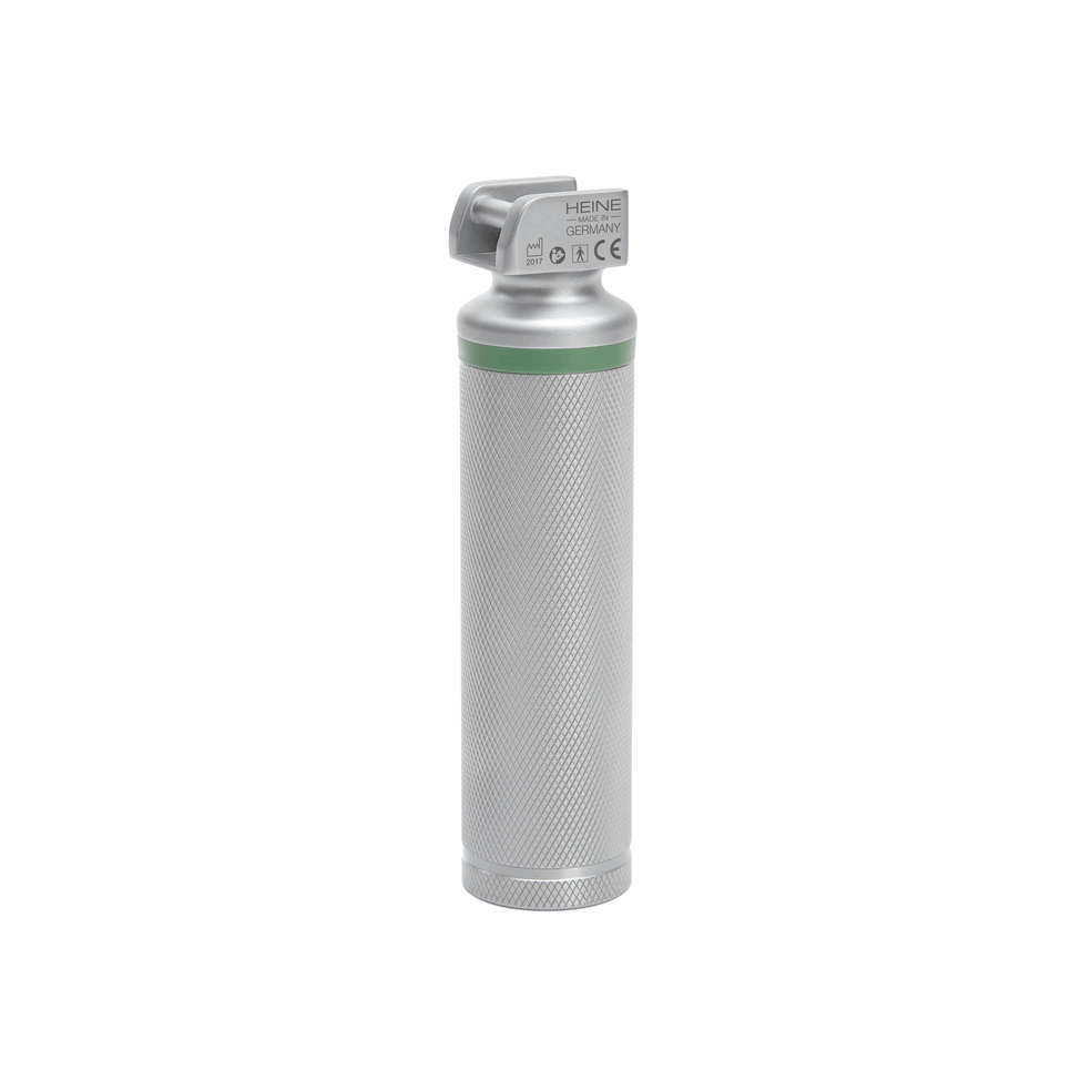 - Heine Kort F. O. 4 LED NT laryngoskophåndtak med LED HQ lys leveres komplett med oppladbart Li-ion batteri integrert i bunnlokket.