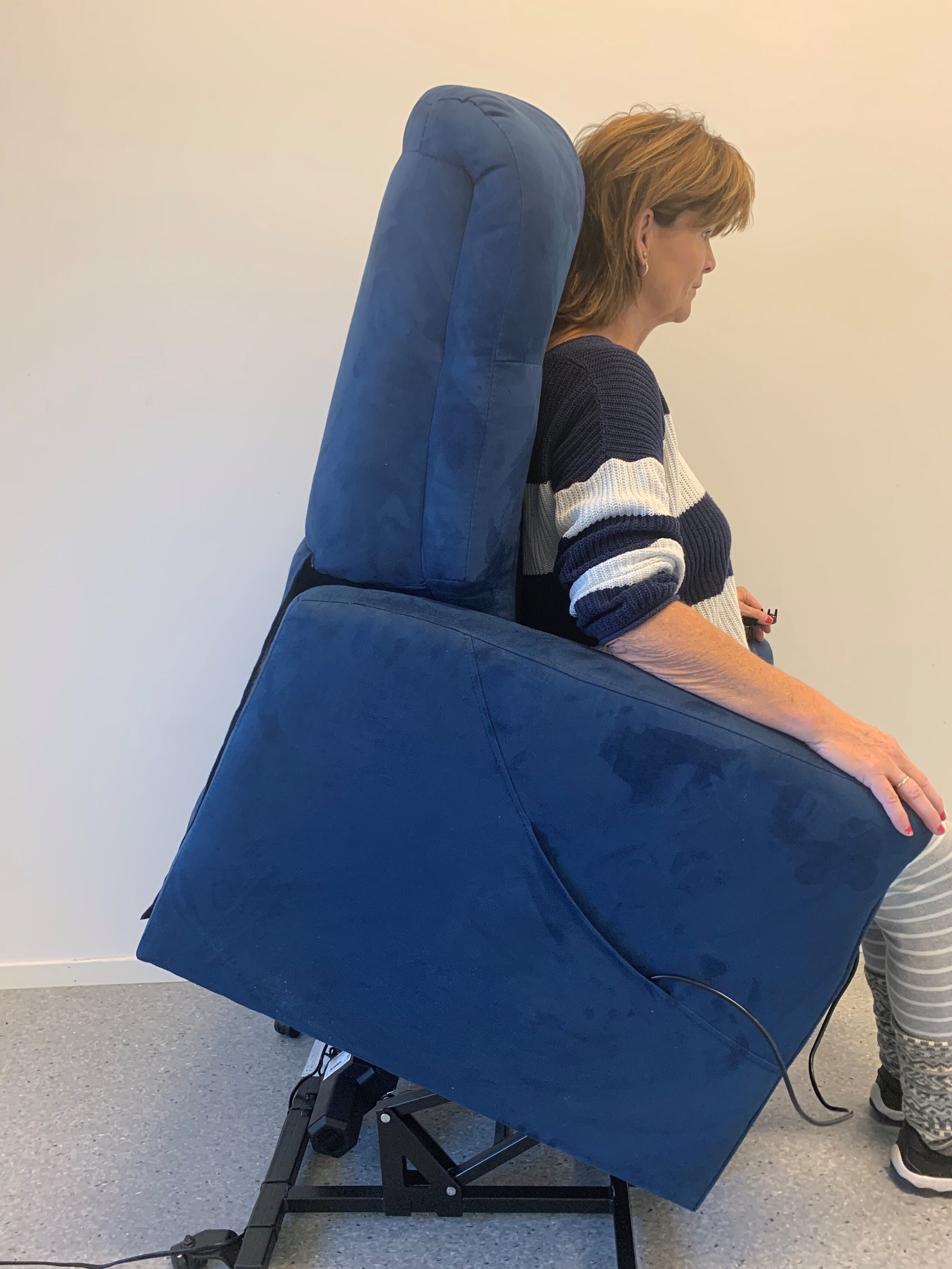 Lenestolen har en drevet løftemekanisme som skyver stolen opp fra basen for å hjelpe brukeren opp til en stående stilling.
