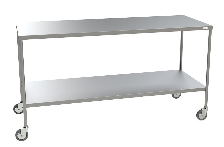 - Instrumentbord 2 hyller, 160 x 60 cm, Villard- Rustfritt stål- Svingbare hjul: Ø 100 mm- Hjul m/brems kan kjøpes utenom (varenr: 395.10)- Høyde: 850 mm