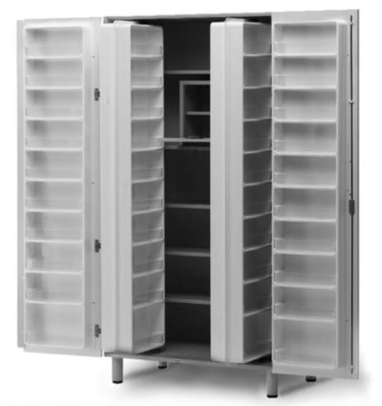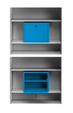Medisinskap som har egen boks for narkotika. Kommer med hyller og skapdører som har praktisk rotering og oppbevaringsmuligheter.