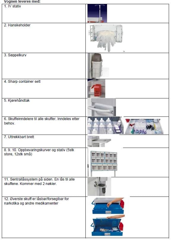- Har nødvendig ekstrautstyr som infusjonsstativ, hanskeholder, søppelkurv, sharp container sett etc.
