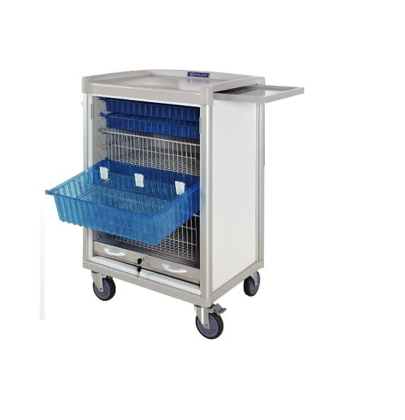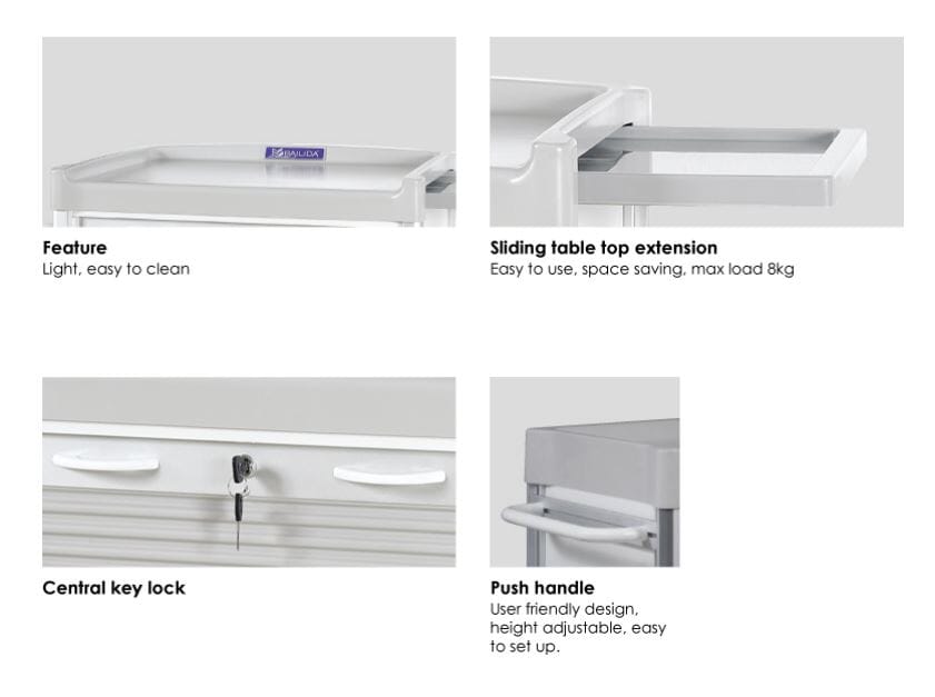 - Str. B716 x D520 x H1025 mm - Kommer med uttrekkbart sidebord og kjørehåndtak- Sentrallås- ABS topp- 4 hjul (12,5cm), 2 med lås, 1 med retningstyring- Passer ISO 60x40cm bakker og kurver.- Uten kurver