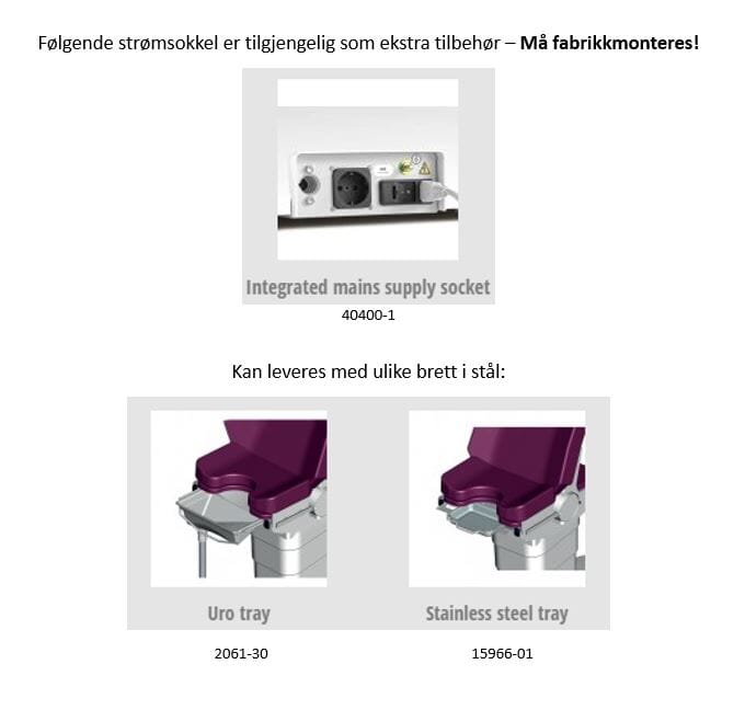 - Tilbehør: Hodepute (11679-01), kolposkopfeste (på forespørsel)